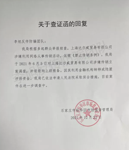 在回复函中,石家庄裕华区市监局表示,“根据多起群众举报核查,我局于2021年6月5日对上海达尔威涉嫌传销立案调查,并逐级向上级报备。因其利用金融机构转移或隐匿涉传资金,我局已依法申请人民法院采取保全措施,目前案件在进一步调查中。”