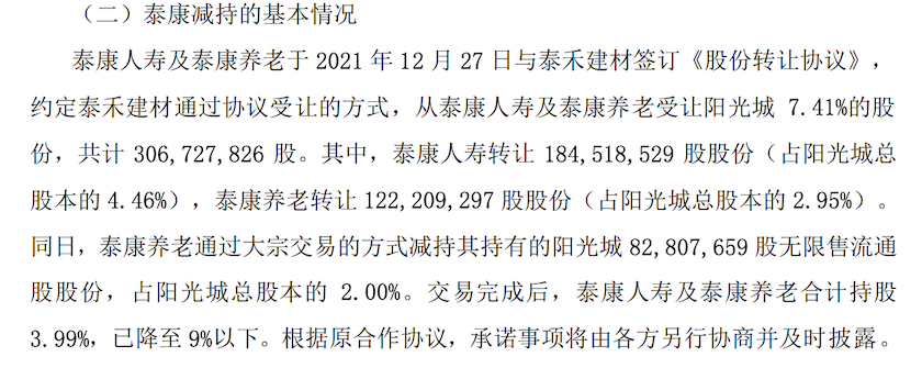 12月28日,阳光城公告称,泰康养老于12月27日通过大宗交易的方式,减持其所持阳光城约8280万股无限售流通股股份,占阳光城总股本的2%。与此同时,泰康人寿及泰康养老与沧州泰禾建材有限公司签订协议,泰禾建材将从泰康人寿及泰康养老受让阳光城7.41%股份,共计约3.07亿股。