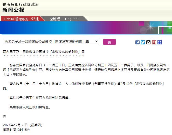 据香港特区政府新闻公报,警务处国家安全处12月30日正式落案控告两名分别三十四及五十二岁男子,以及一间网媒公司各一项“串谋发布煽动刊物”罪。国安处亦向涉案公司派递检控书,通告该公司违反上述罪行及要求有关公司派代表出席今日下午的提讯。