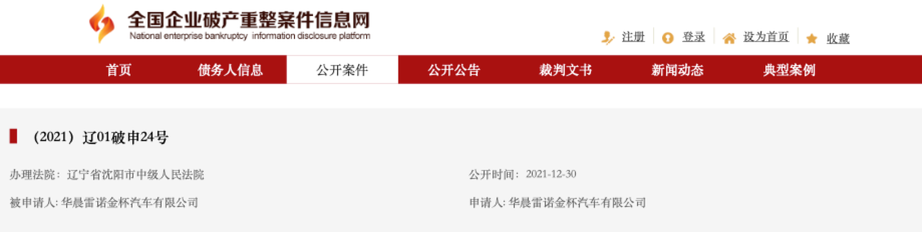 据全国企业破产重整案件信息网显示,12月30日,华晨雷诺金杯有限公司申请破产,案号为(2021)辽01破申24号,经办法院为辽宁省沈阳市中级人民法院。