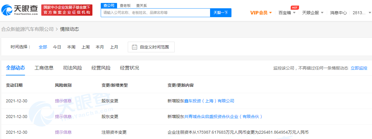 天眼查App显示,12月30日,哪吒汽车关联公司合众新能源汽车有限公司发生工商变更,股东新增中信证券投资有限公司、鑫车投资(上海)有限公司等,同时公司注册资本增至约22.65亿人民币。