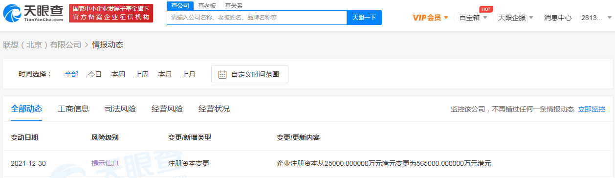天眼查App显示,12月30日,联想(北京)有限公司发生工商变更,公司注册资本由2.5亿港元增至56.5亿港元,增幅达2160%。