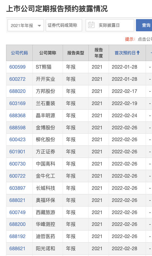 上交所网站显示,上交所年报预约披露时间表出炉,st熊猫、开开实业拔得头筹,将于1月28日率先披露。