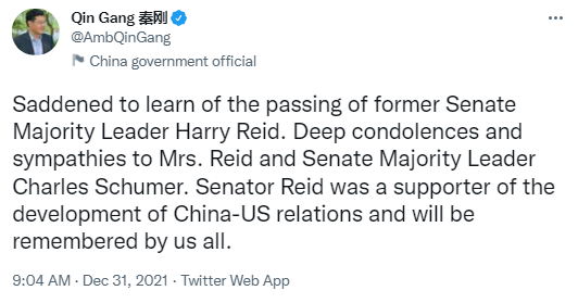 中国驻美国大使秦刚12月31日在推特上表示,悲痛地获悉美国参议院前多数党领袖哈里·里德(Harry Reid)去世,向里德夫人和美国参议院多数党领袖舒默表示深切慰问和同情。秦刚称:“里德参议员是中美关系发展的支持者,我们所有人都将铭记他。”