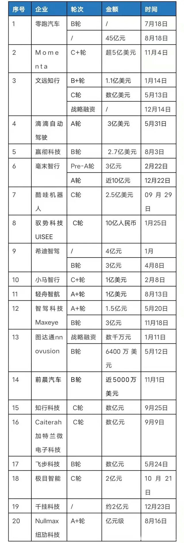 这其中,有代表的是两家公司,一家是Momenta,另一家是滴滴自动驾驶。11月4日,Momenta宣布完成C+轮超过5亿美元融资,至此,Momenta C轮累计融资额已超过10亿美元,成为2021年自动驾驶领域最大规模的融资;而另一家滴滴自动驾驶在5月31 日获得广汽集团等机构超3亿美元的投资后,估值约60亿美元,已超过小马智行的53亿美元的估值,成为无人驾驶公司中估值最高企业。