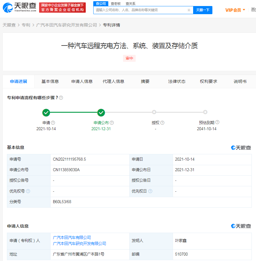 天眼查APP显示,12月31日,广汽本田汽车研究开发有限公司公布“一种汽车远程充电方法、系统、装置及存储介质”专利。