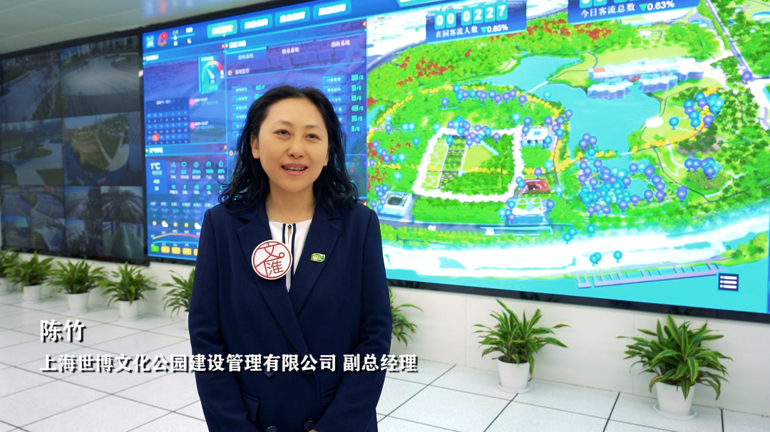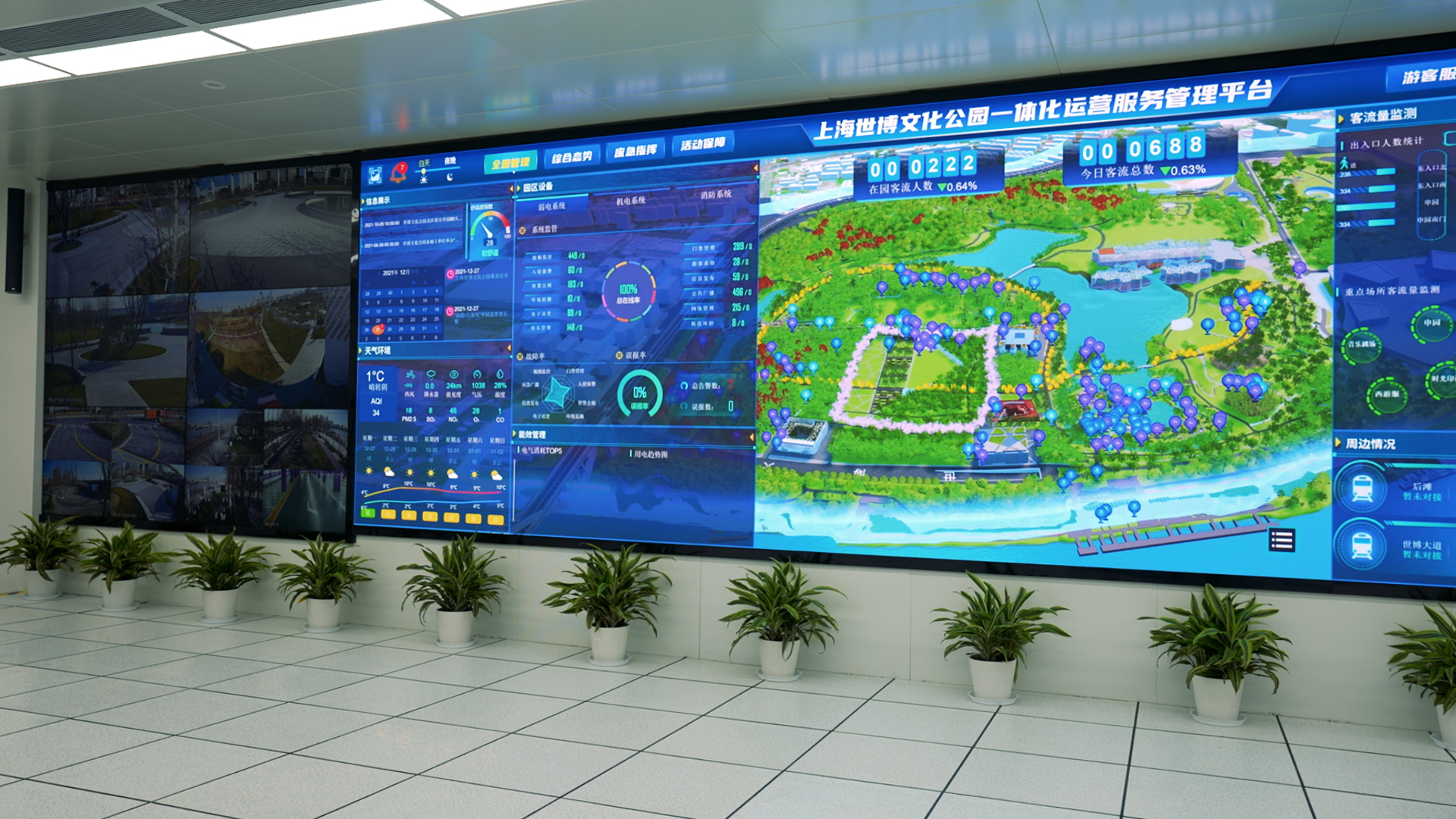我们走进公园的指挥中心一探究竟。首先映入眼帘的就是一块巨大的电子屏幕。公园实景监控镜头、客流量等各类数据、预警信息有序排布着。上海世博文化公园建设管理有限公司副总经理陈竹介绍,这就是上海世博文化公园一体化运营管理平台,也是智慧公园管理的“指挥大脑”。
