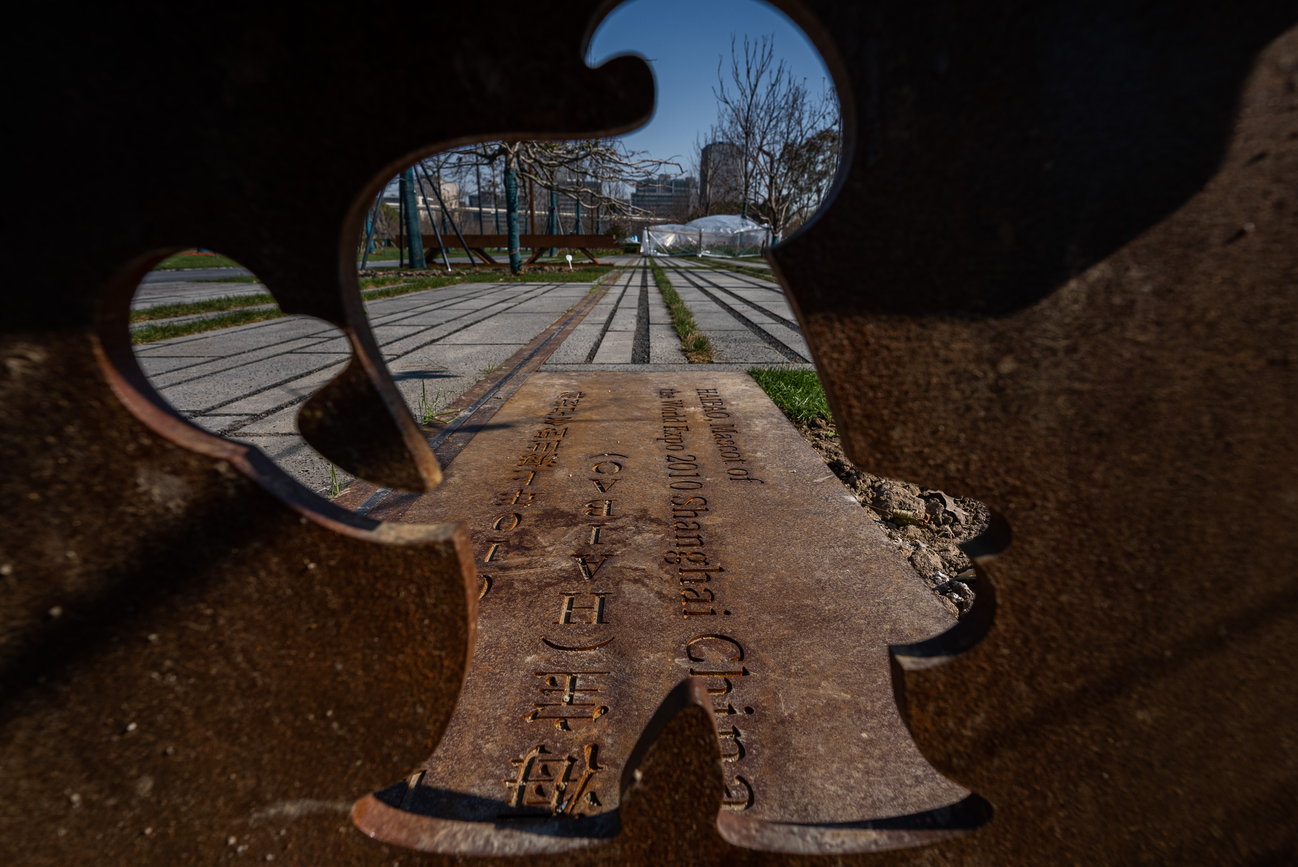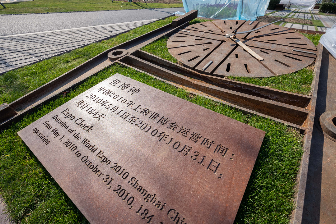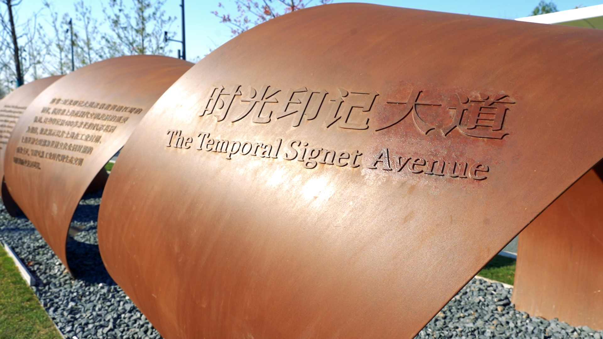 往前走,便来到了时光印记大道的起点。这条总长约400米的大道,承载着黄浦江畔的回忆,沉淀着上海近现代文明发展的重要轨迹。一路上,钢板制成的“时光卷轴”、28根钢铁树干、海宝雕像、世博钟等印记以线形花园为载体,依次展示了这片土地从钢铁工业时期、上海世博会时期再到世博文化公园时期的面貌变迁,呈现从它工业时代到生态文明时代的历史发展进程。