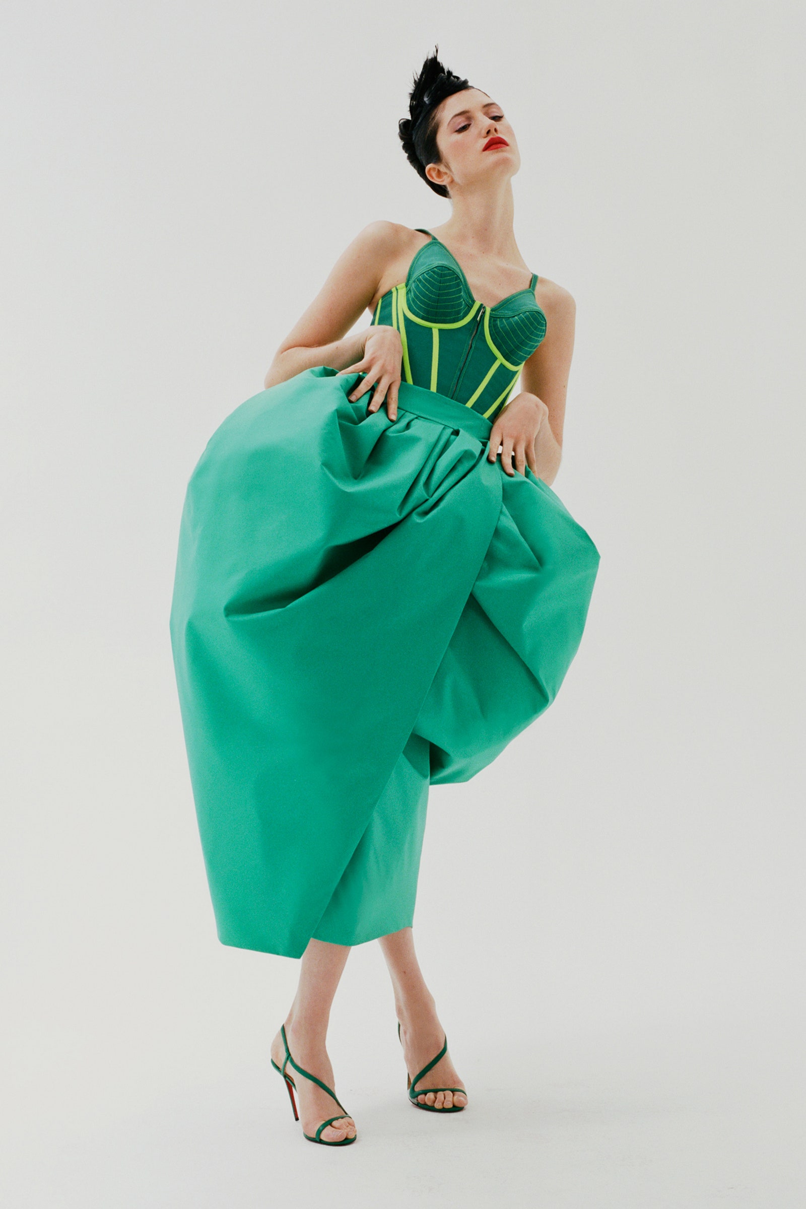 后起之秀Christopher John Rogers的这条裙子准确来讲,应该叫做泡泡裙。这种带有哑光效果的缎面裙是上世纪好莱坞黄金时代女星们的最爱,设计师通过环绕交叠使裙装呈现出饱满而轻盈的轮廓,翠绿色也显得十分生机。