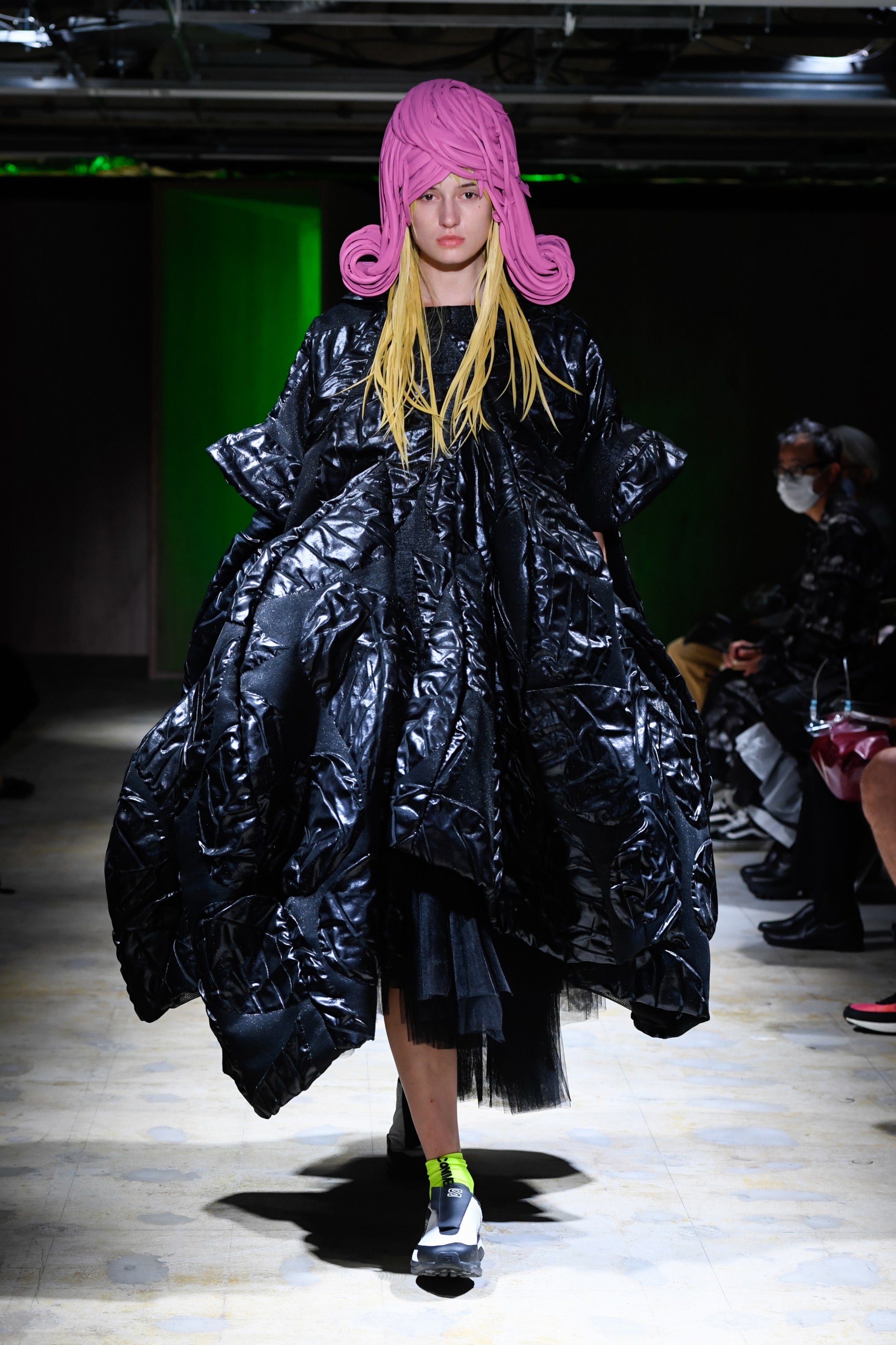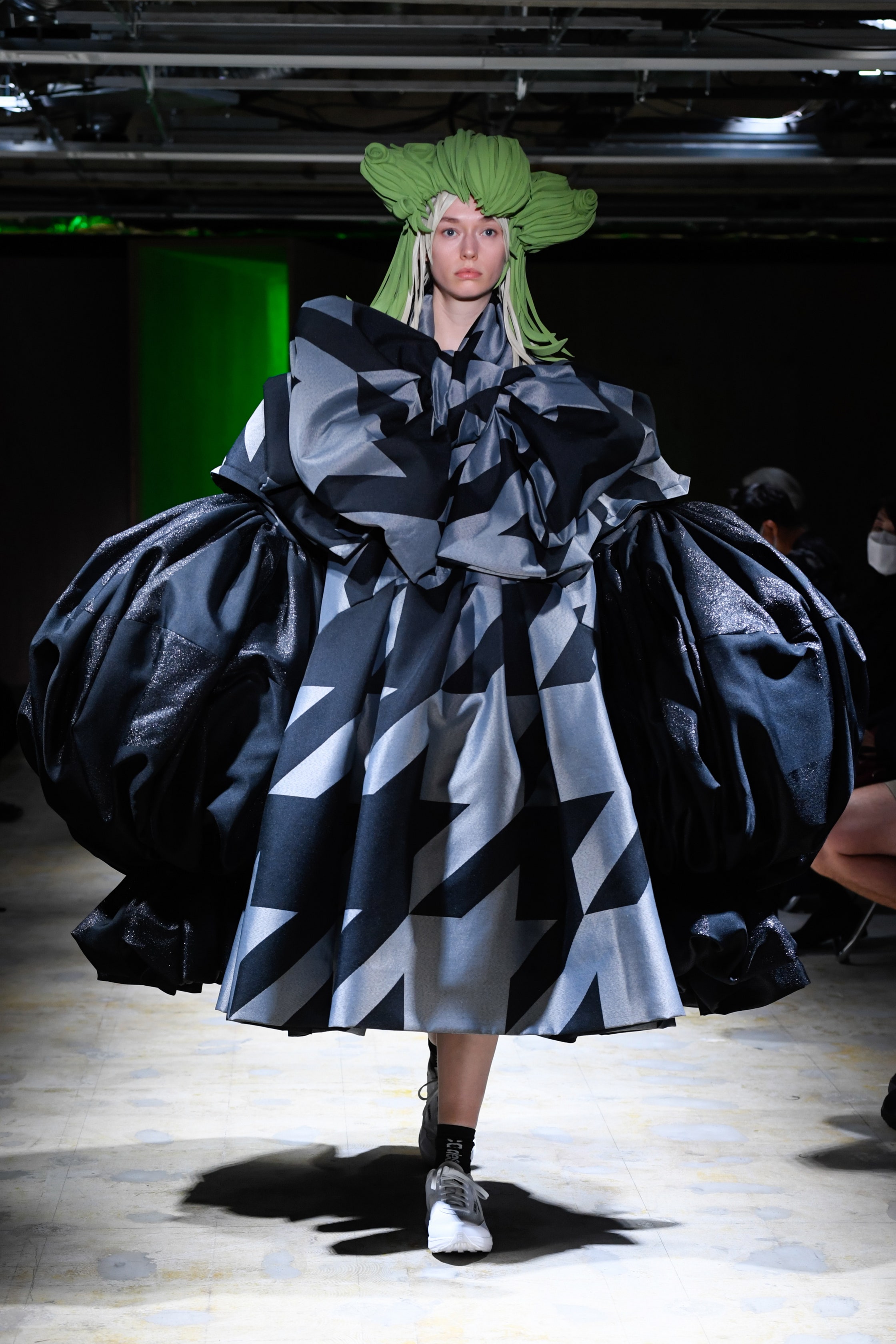 川久保玲也是蓬裙爱好者,但她的思路明显更为前卫。在新系列中,这位日本设计师继续探讨服装和身体之间的关系,白色雏菊印花、千鸟格纹和蝴蝶结纹样被用于廓形夸张的大型蓬裙上,搭配独特的压制和印染工艺,视觉冲击感极强。