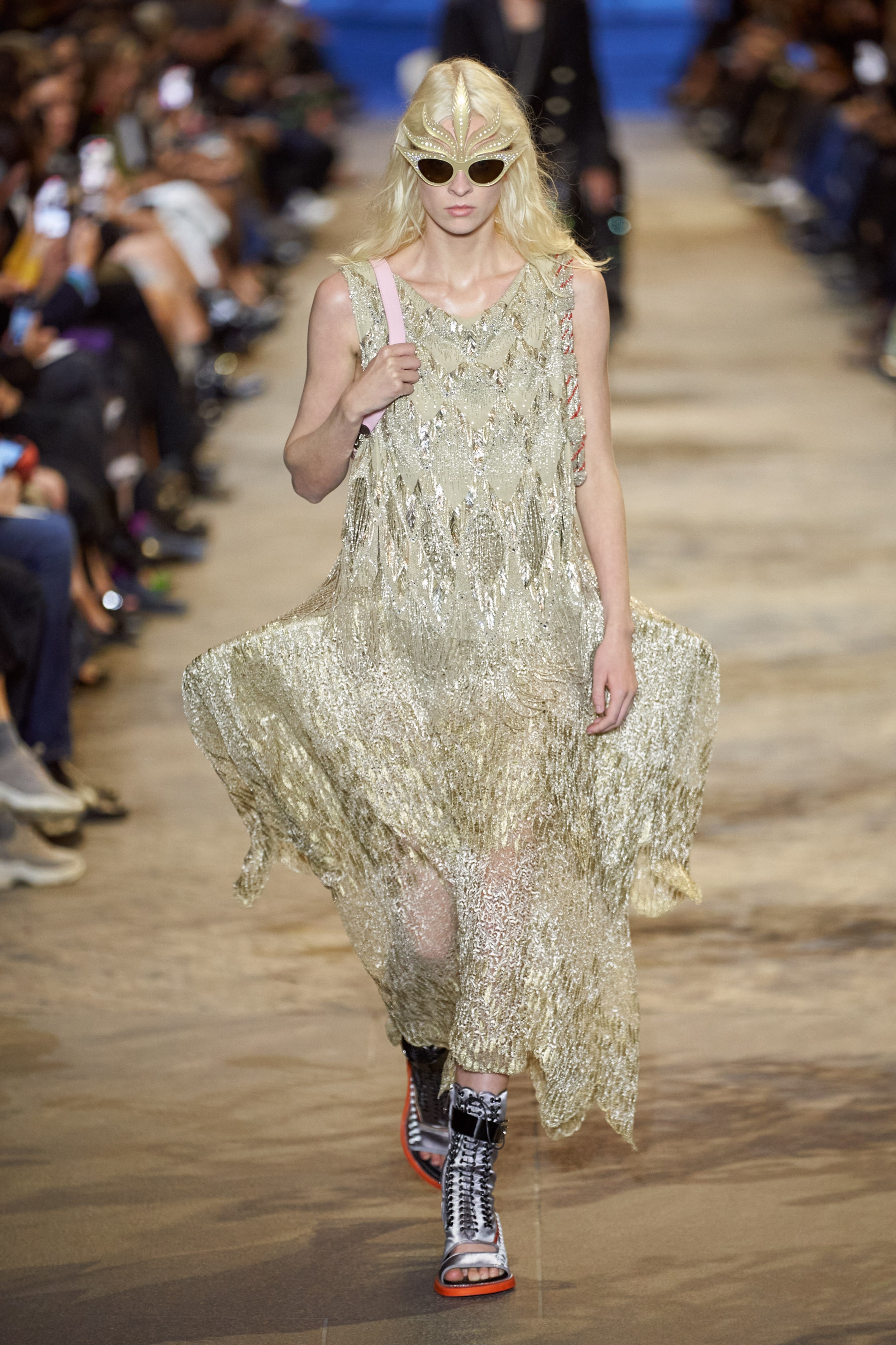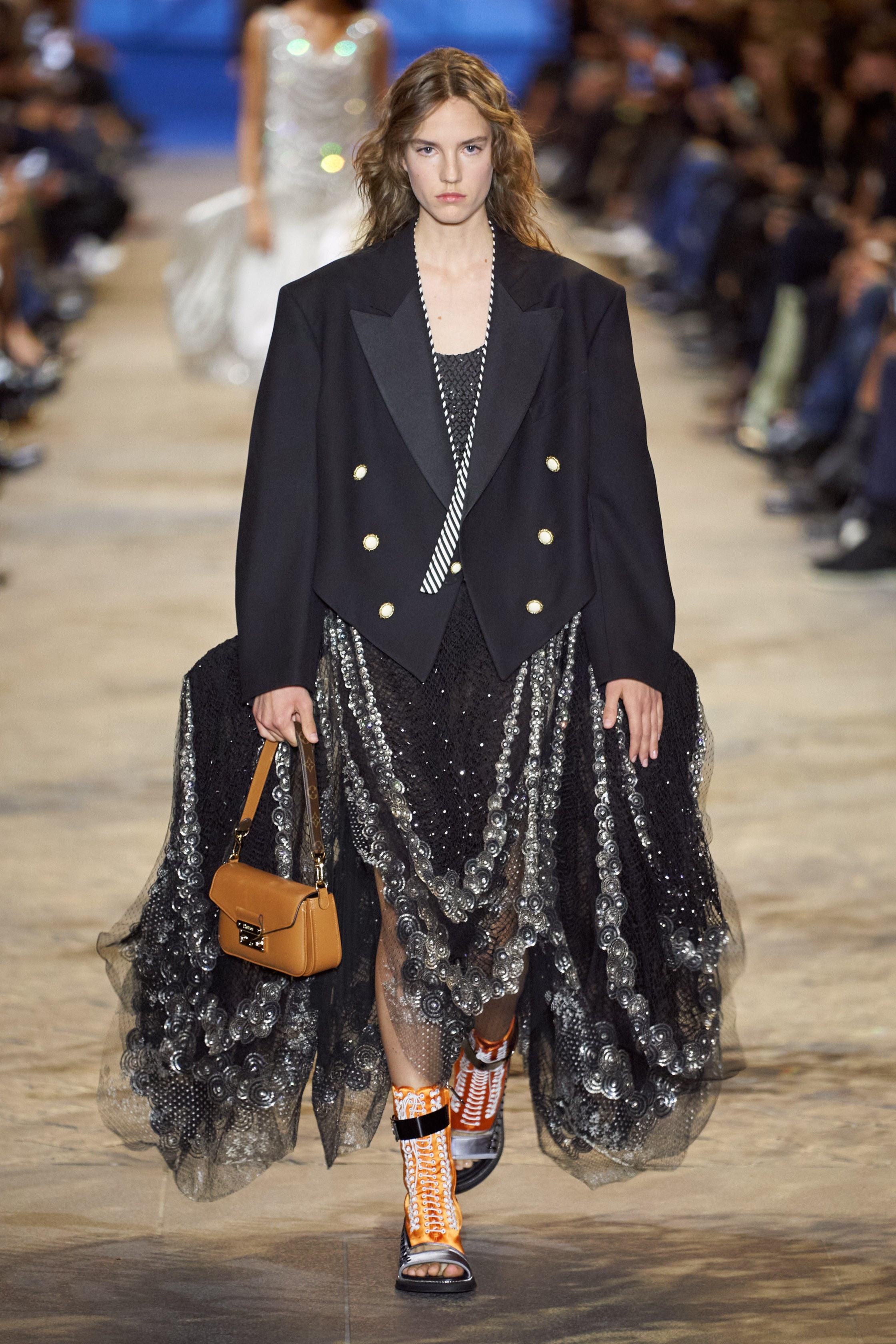 在路易威登2022春夏系列发布会上,女装创意总监Nicolas Ghesquière将卢浮宫秀场称为“盛大的舞会”,用裁剪利落的夹克和镶满金线刺绣的丝绸上装来搭配蓬裙。相较于百年前的模样,路易威登这里的蓬裙更短,同时也更便于行动,有意为之显现的裙摆骨架带来了独特的矛盾观感。