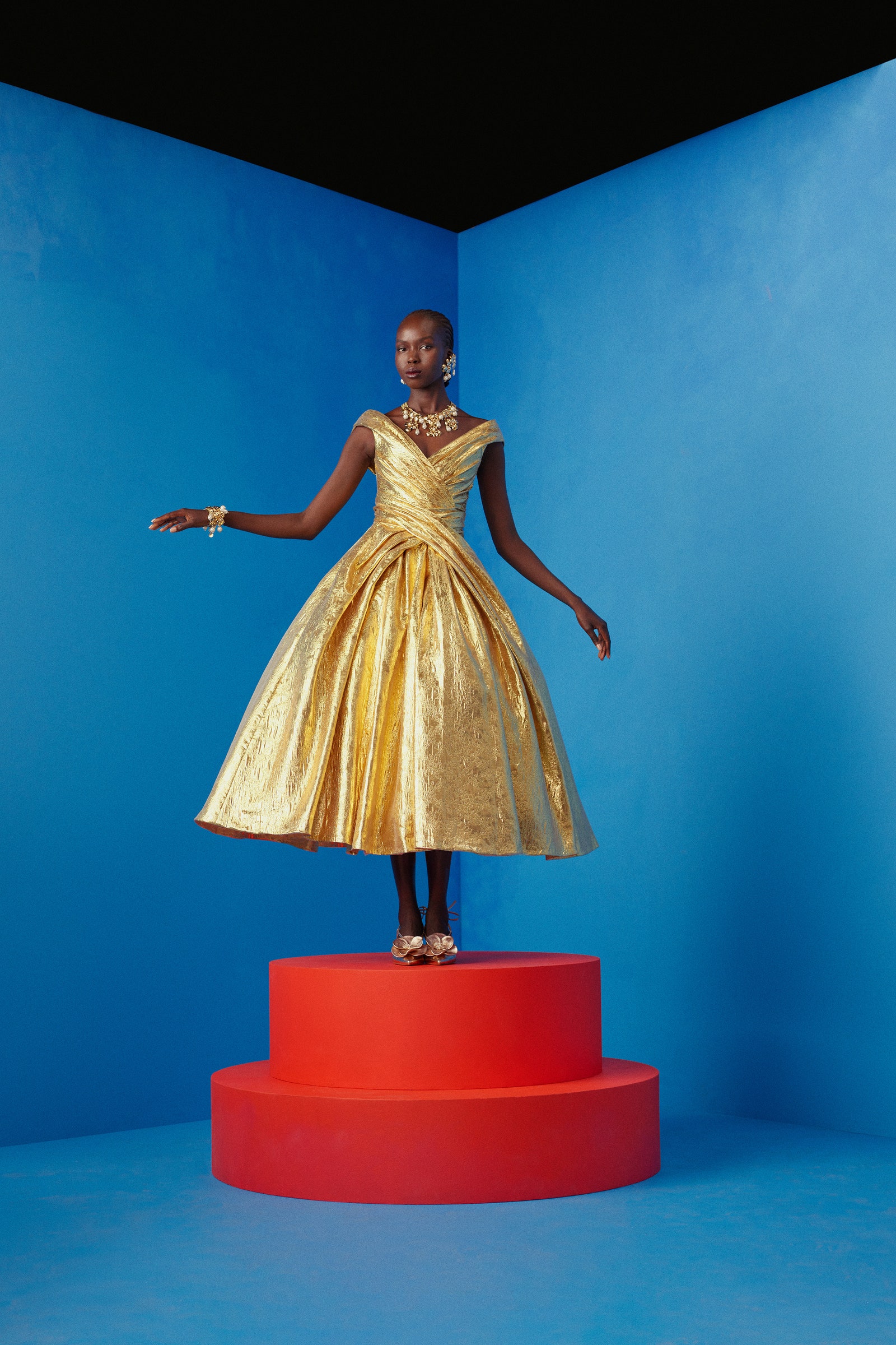 来自Carolina Herrera的金色蓬裙有着被撑得足够大的骨架,但又不至于挡住别人的道路。上半身交叠形成的V形领口借助褶皱将交叉的视觉效果延伸到裙摆,熠熠生辉的金属光泽面料上有着细腻的花卉刺绣纹样。