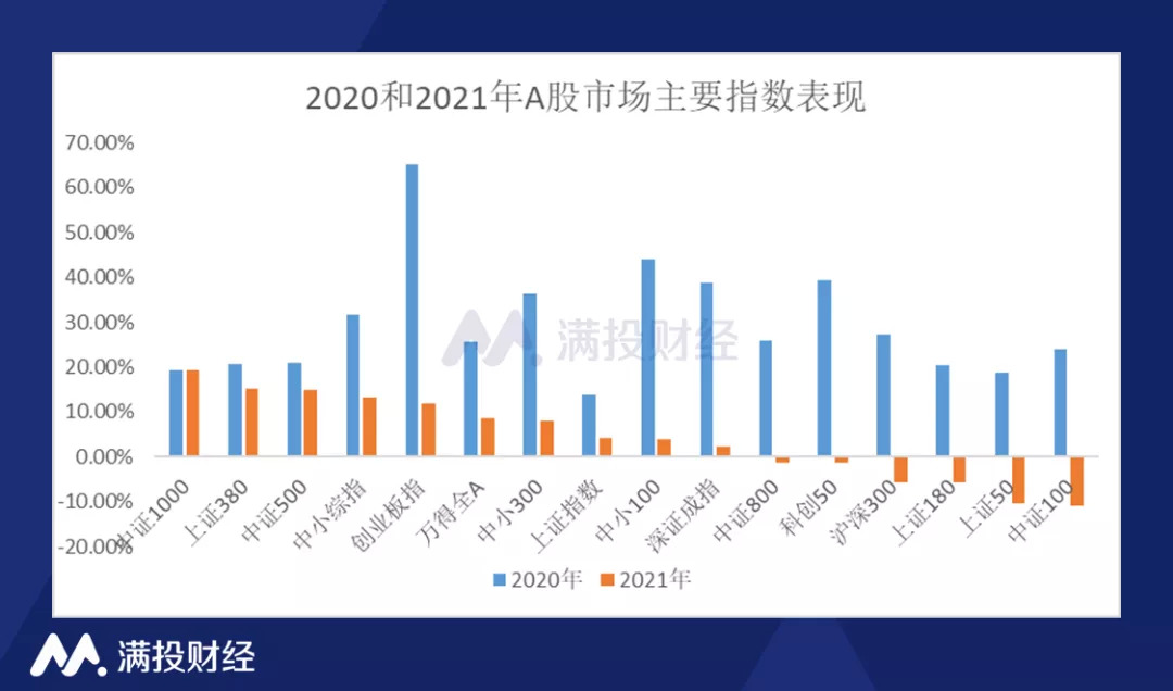 回顾2021年的A股市场行情,整体赚钱效应不如2020年。截至2021年12月30日,A股市场主要指数的表现均不及2020年,只有中证1000指数收益与2020年相当,上涨19.23%。中证100、上证50、上证180、沪深300、科创50、中证800指数收益率均为负。
