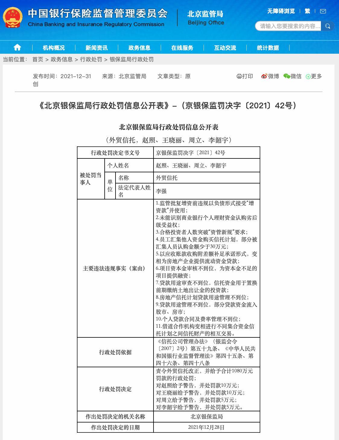 12月31日,北京银保监局行政处罚信息公开表显示,外贸信托因存在11项主要违法违规事实,被北京银保监局合计罚款1080万元。