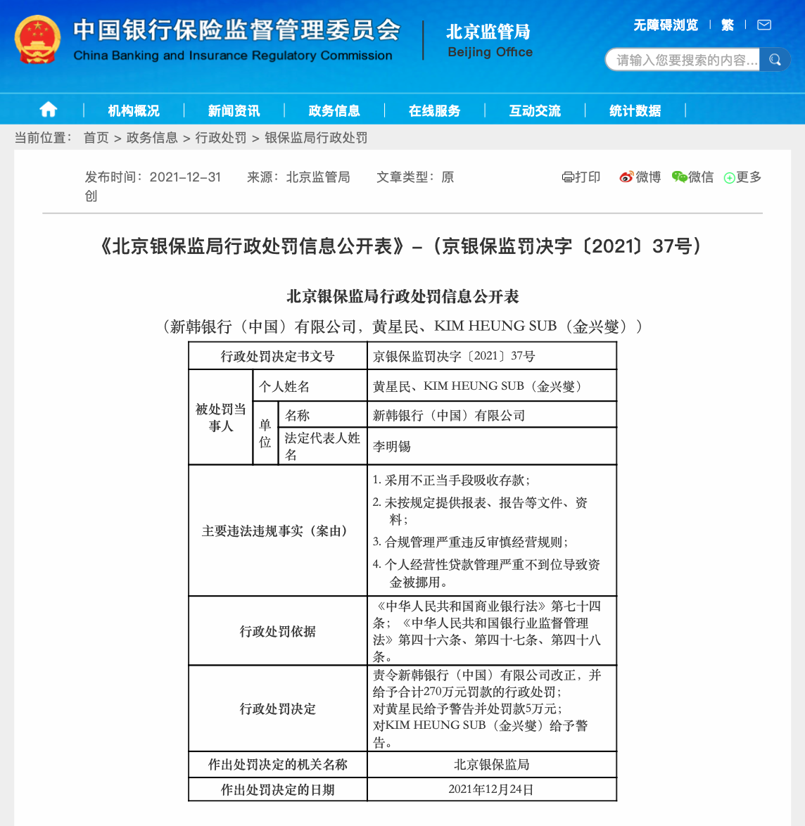 12月31日,北京银保监局行政处罚信息公开表显示,新韩银行(中国)有限公司因存在4项主要违法违规事实,被北京银保监局合计罚款270万元。