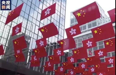 大街小巷挂满了五星红旗和紫荆花区旗,祝福祖国的横幅随处可见。