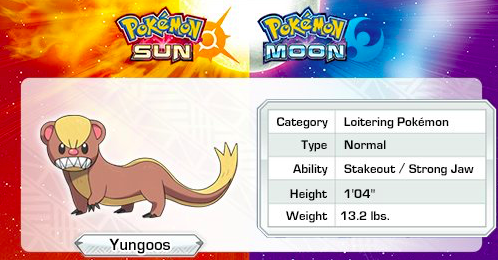 阿罗拉地区栖息了大量口袋妖怪,不过目前任天堂仍未公布所有相关精灵的详细信息。除了在早前公布的部分口袋妖怪外,本次直播中任天堂也确认了一只形态类似蜜獾的“Yungoos”以及鸟类形态的口袋妖怪“Pikipek”,两只精灵可以在游戏的早期阶段捕获。在E3游戏展上提供的试玩中,玩家们有机会体验到这两只新设计的口袋妖怪。