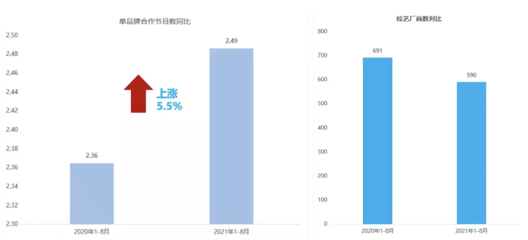 社会价值之外,综艺IP的商业价值也有变化。根据击壤洞察发布的《大环境下综艺市场的发展与布局》,2021年1月-8月期间综艺合作厂商数为590家,同比去年减少近100家,部分品牌流出。不过,从单品牌合作节目数量来看,品牌主对综艺节目的合作需求是上涨的。