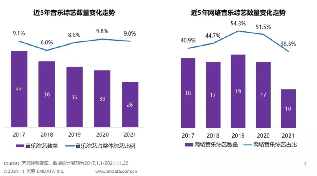 从整体市场大盘来看,据《2021音乐综艺市场研究报告》,自2017年至2021年五年时间,音乐综艺数量逐步下滑,今年共上线26部音乐综艺,同比去年下滑21%,其中网络音乐综艺数量为10档,相比去年的17档也下滑不少。