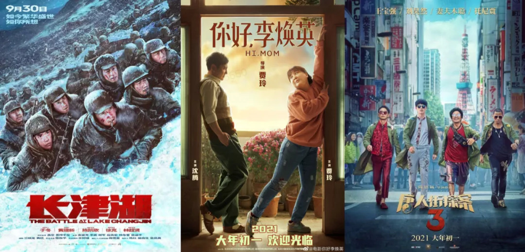 不断刷新中国内地影史票房榜单的爆款接连出现,年初《你好,李焕英》收获54.13亿票房,11月,《长津湖》带来更大惊喜,一举登上历史票房榜首。当然还有《唐人街探案3》,45.23亿票房位列历史票房第六名。三部影片为2021年贡献了超过35%的票房收入。