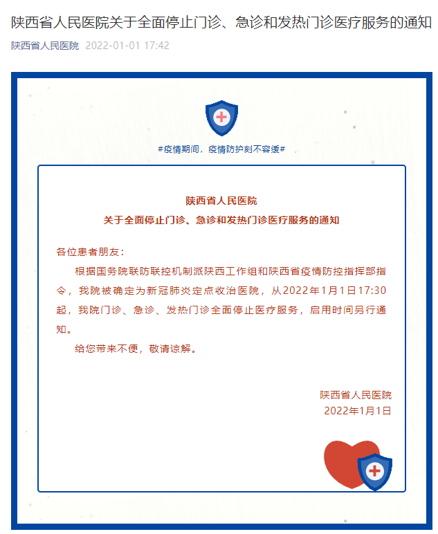 1月1日,陕西省人民医院发布通知,根据国务院联防联控机制派陕西工作组和陕西省疫情防控指挥部指令,陕西省人民医院被确定为新冠肺炎定点收治医院,从2022年1月1日17:30起,该院门诊、急诊、发热门诊全面停止医疗服务,启用时间另行通知。