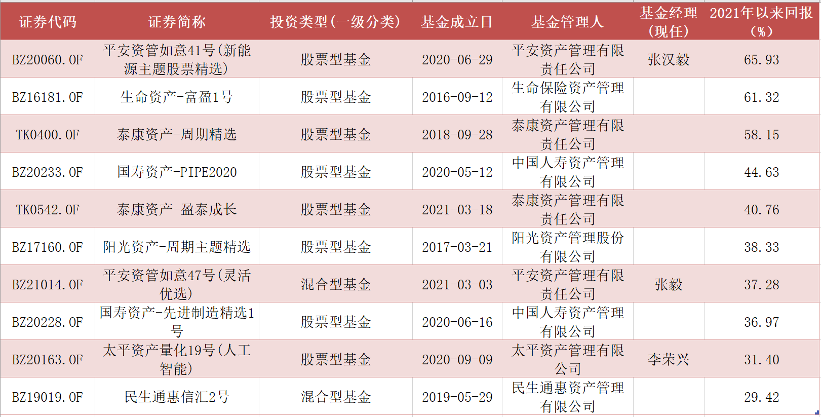 包括股票型、混合型在内的权益类资管产品中,2021年回报率排名靠前的产品多与热点板块相关。