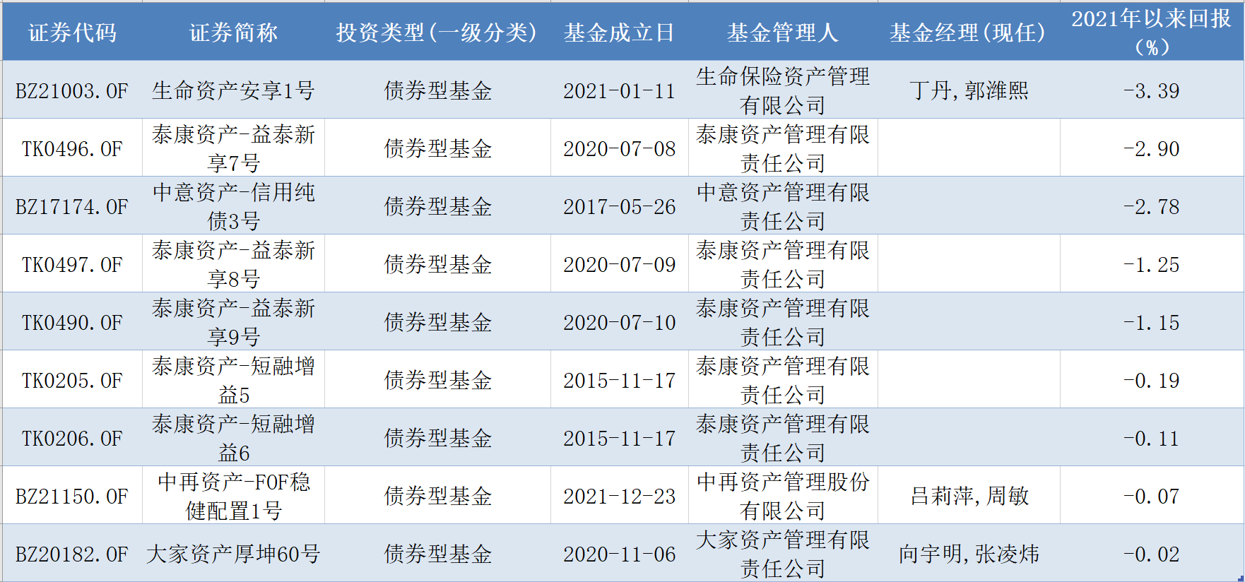 另一方面,在未取得正收益的仅9只产品中,生命资产安享1号跌幅最大,为-3.39%。泰康资产旗下的益泰新享7号、益泰新享8号、益泰新享9号、短融增益5、短融增益6也未能收正。