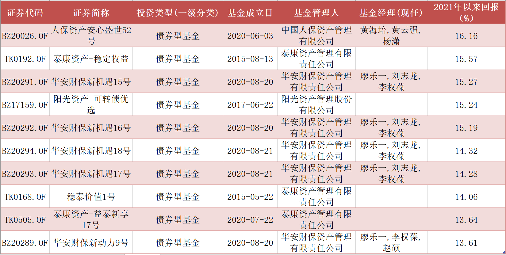 此外,泰康资产旗下的泰康资产-稳定收益、稳泰价值1号、益泰新享17号,以及阳光资产-可转债优选回报率均超13%。