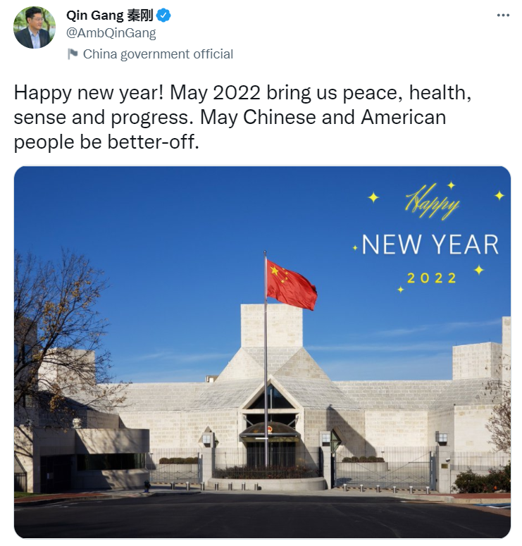 中国驻美国大使秦刚1月1日在推特发文称:“新年快乐!愿2022年带给我们和平、健康、理智和进步。愿中美两国人民都能过得更好。”