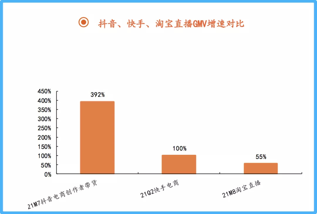 平安证券发布的报告指出,从2020年全年GMV看,淘宝直播GMV达4000亿,抖音直播GMV在5000亿左右(其中抖音小店GMV 1000亿+),快手直播GMV达到3812亿(2021Q1快手小店GMV占比达85%),直播电商整体呈现三足鼎立竞争格局;但在2021年抖音电商GMV同比增速已经明显超过淘宝直播和快手,2021年7月抖音电商创作者带货GMV同比增长392%,2021年Q2快手电商保持100%左右高速增长,2021年8月淘宝直播GMV增速仅为55%。