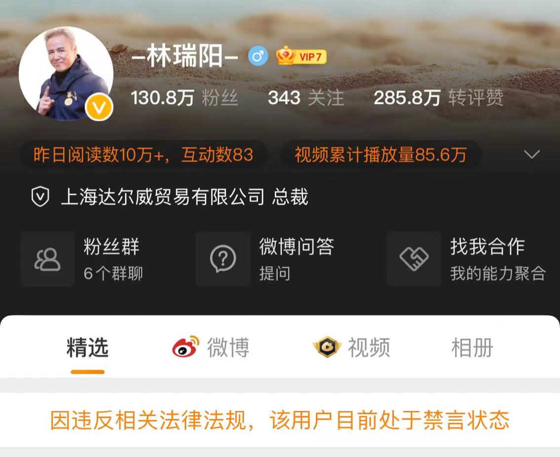 1月2日消息,张庭林瑞阳夫妇微博被禁言,二人微博个人主页均显示“因违反相关法律法规,该用户目前处于禁言状态”。