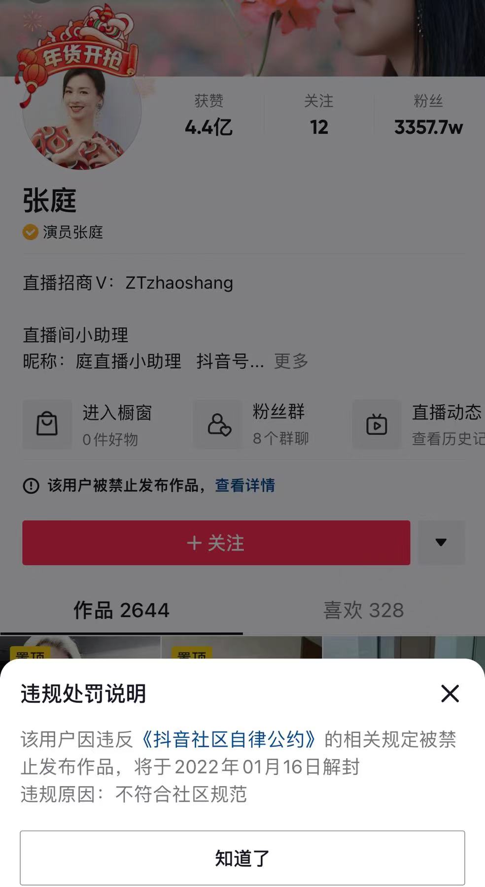1月2日,“TST庭秘密”品牌创始人张庭抖音账号被禁止发布作品,抖音违规处罚说明显示,张庭因违反《抖音社区自律公约》的相关规定被禁止发布作品,违规原因为“不符合社区规范”,账号将于2022年1月16日解封。此外,张庭、林瑞阳夫妇微博账号均已被禁言。