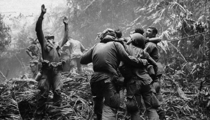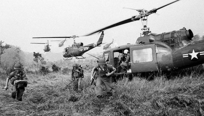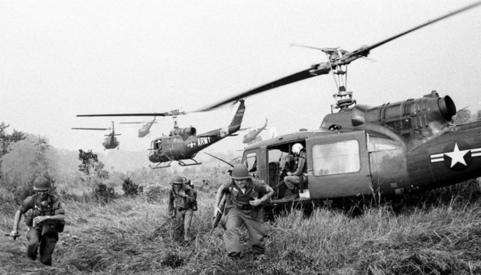 美国陆军拥有的飞机一部分是固定翼的,但大部分还是各种各样的旋翼式飞机。如图,陆军直升机在越南战场上运送士兵。↓