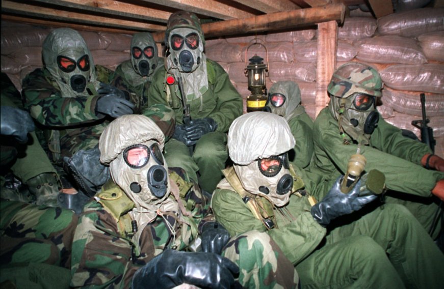 美国陆军在沙漠风暴军事行动中表现出色。沙漠风暴是以美国为首的联军从伊拉克占领下解放科威特的一次行动。美军开始轰炸伊拉克后,针对萨达姆可能发起的化学武器战争,陆军第七军团士兵穿着防护装备。↓