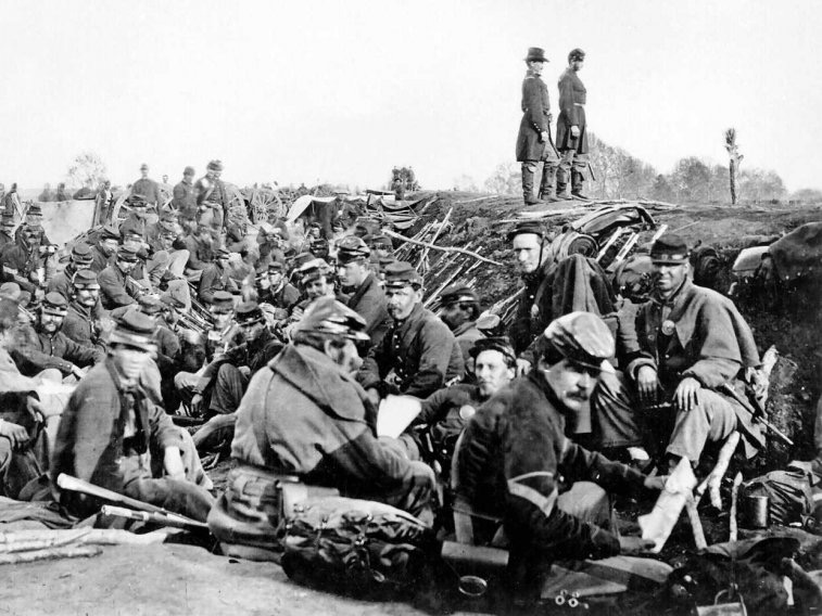 美国陆军照片中,最早有一些是内战时期南部邦联的军队。下图为南军士兵在钱瑟勒斯维尔(Chancellorsville)战役中沿着佛里德里克堡(Fredericksburg )附近的拉帕汉诺克河(Rappahonnock River)西案扎营的情景。↓