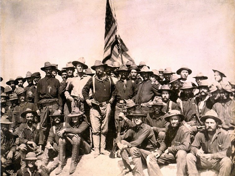 陆军史上一支著名的军队是泰德・罗斯福指挥的“莽骑兵”(“Rough Riders”)。下图是1898年他们在圣胡安战役中。↓