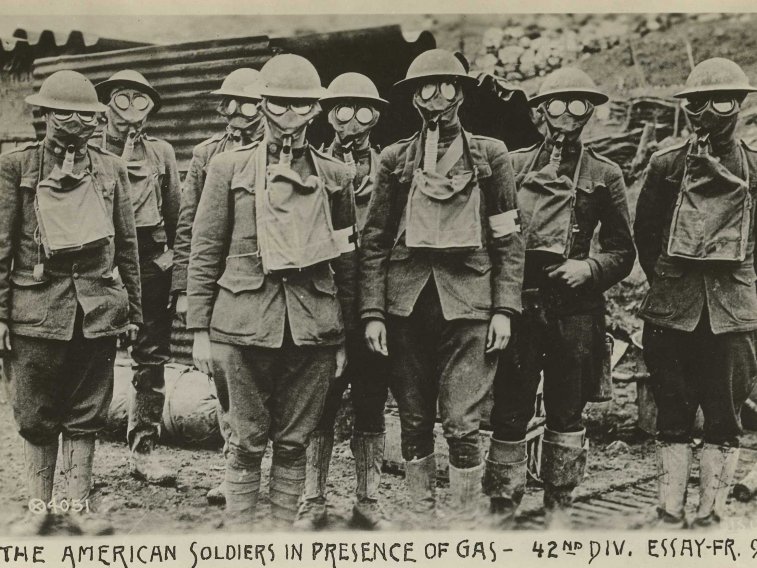 这幅摄于1918年的图片显示美军士兵在法国带着防毒面具。↓
