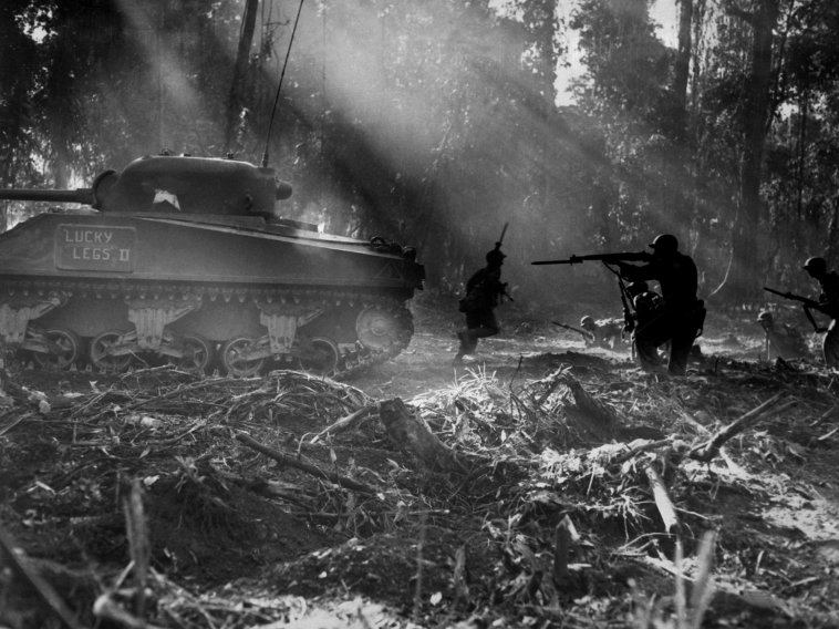 在对日太平洋战争中,陆军还与海军陆战队并肩战斗。下图为所罗门群岛的机械步兵在M4雪曼坦克的掩护下前进。↓
