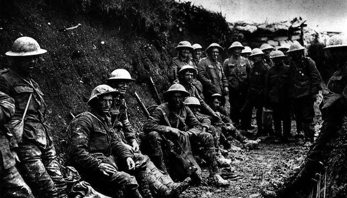 一战标志着堑壕战和毒气战的开始。在欧洲到处挖着堑壕,泥泞不堪,老鼠跳蚤横行,传染病蔓延。下图美国士兵1915年在堑壕中。↓