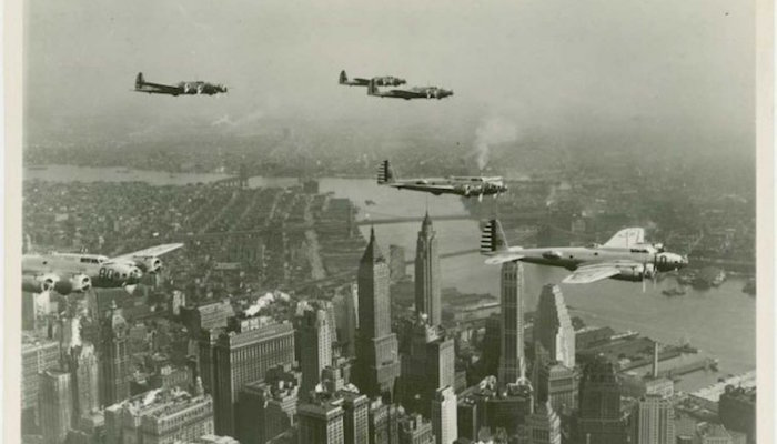 陆军自1910年开始购入固定翼飞机,图中是1939年陆军飞机飞越曼哈顿上空。↓