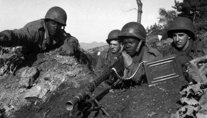 杜鲁门总统于1948年废除军队种族隔离制度,朝鲜战争不同肤色士兵并肩作战的首次大型军事行动。↓