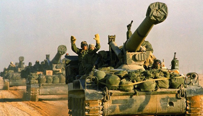 配备着155毫米自动推进榴弹炮的第七军团向科威特边境推进,驱除伊拉克军队。↓