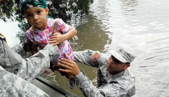 陆军国民警卫队在全球执行维和任务,并协助遭受自然灾害的美国公民。图为2012年美军路易斯安那国民警卫队队员在飓风艾萨克肆虐中救出被困的小孩。↓