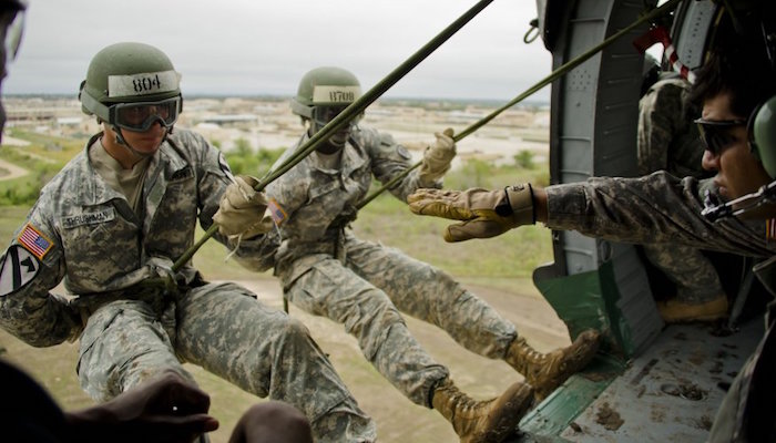 在Fort Hood空中突袭学校,士兵们训练从黑鹰直升机上做绳降训练。↓