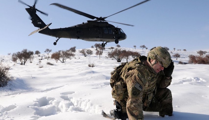 西科斯基UH-60“黑鹰”中型通用直升机放下一名士兵。黑鹰自1979年起服役至今,成本约为2130万美元。↓