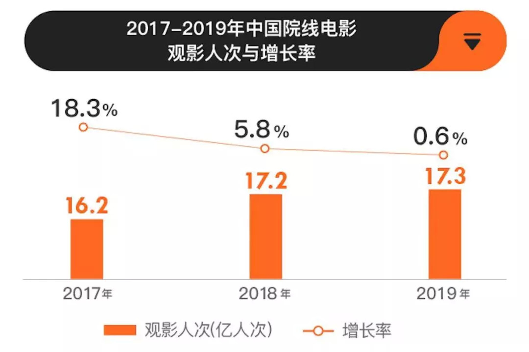 在疫情前,中国电影市场已经很敏锐的感知到了观影人次上涨的“平稳”。2017年,中国电影市场的观影人次是16.2亿到了2019年为17.3亿,增长率从18.3%下降到了0.6%。