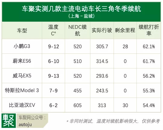 根据车聚君的实测,多数电动车在长三角的冬季续航打折率在60%左右,如果是磷酸铁锂电池(包括刀片电池)会更低。