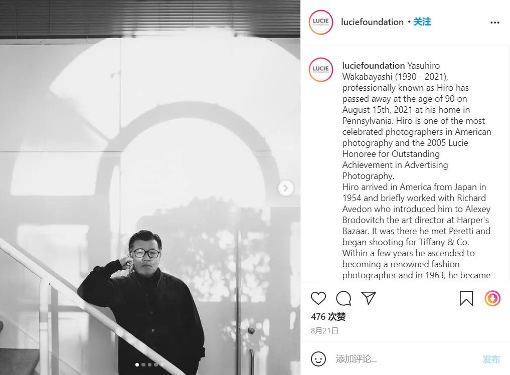 2021年8月20日,日裔美国摄影师 Yasuhiro Wakabayashi 去世,享年90岁。Yasuhiro Wakabayashi也被称为 Hiro。
