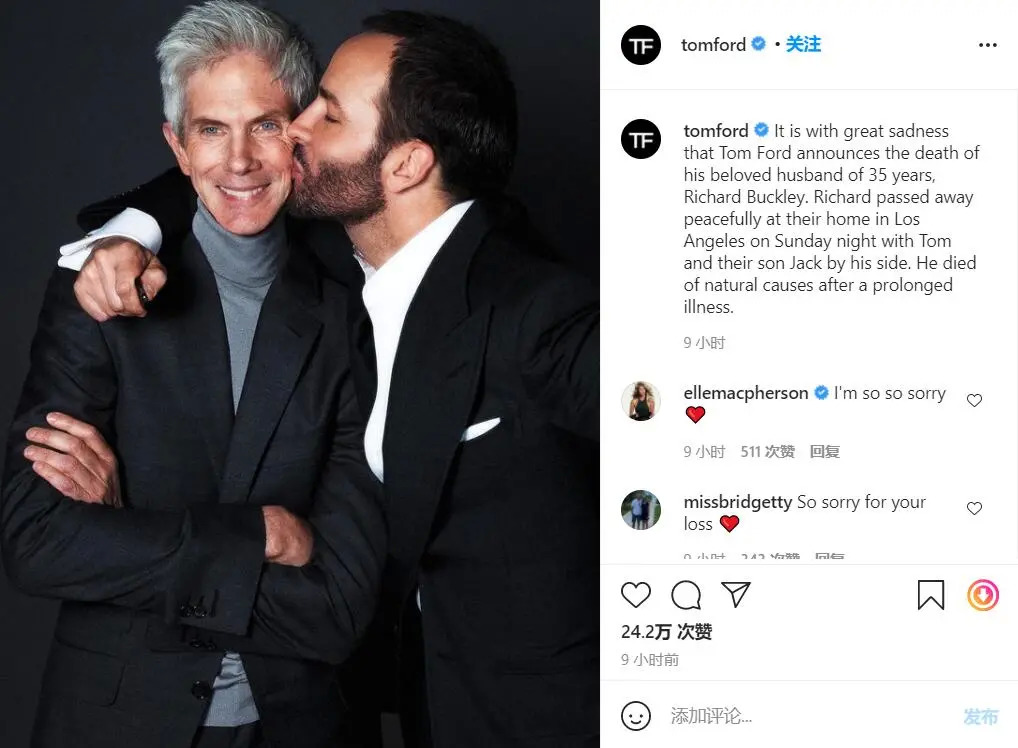 (详见《华丽志》:Tom Ford 35年的伴侣、美国资深时尚记者 Richard Buckley 去世,享年72岁)