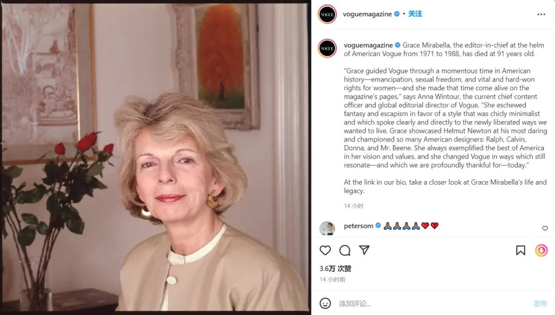 2021年12月23日,于1971年至1988年担任美国版《Vogue》主编的 Grace Mirabella 去世,享年91岁。